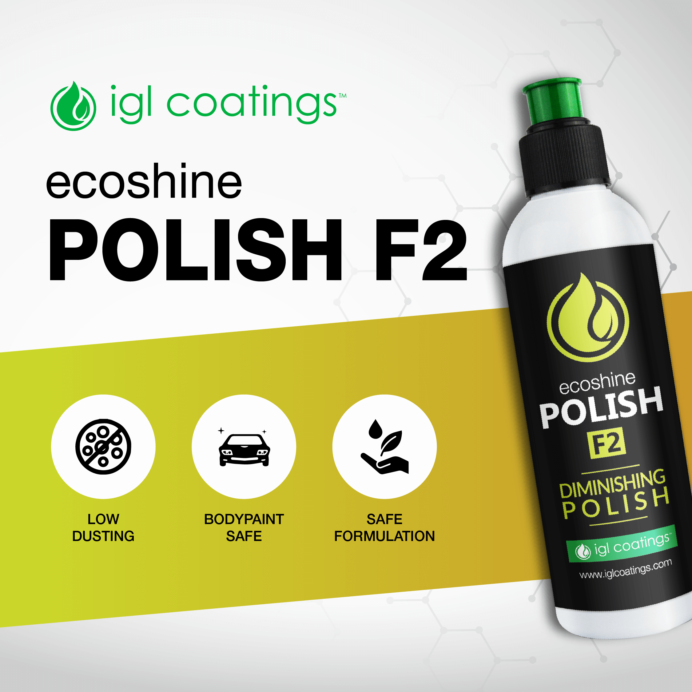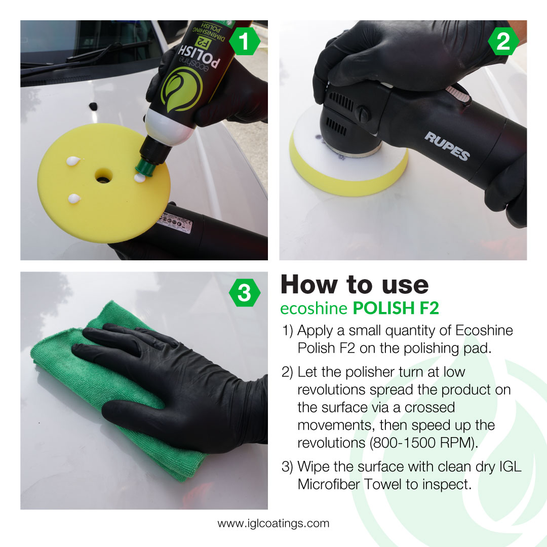 Suitable for both dual action and rotary polishers to remove halos and holograms for a flawless finish. Ecoshine Polish F2 is the cleanest polish. Achieve professional-level results from the comfort of your garage. This versatile polish is effective on oxidized surfaces and new paints.